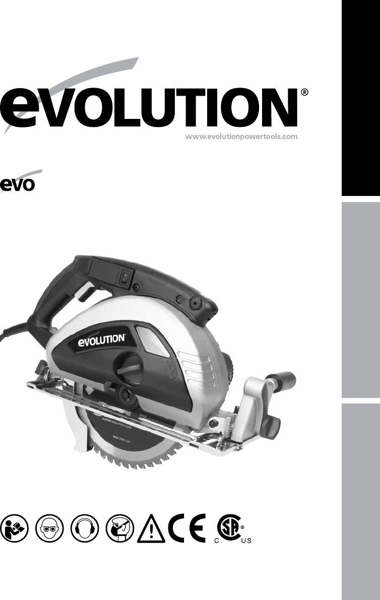 8www.evolutionpowertools.comSymbol DescriptionVVoltsAAmperesHzHertzMin-1Speed~Alternating CurrentnoNo Load SpeedWear Safety GogglesWear Ear Protection